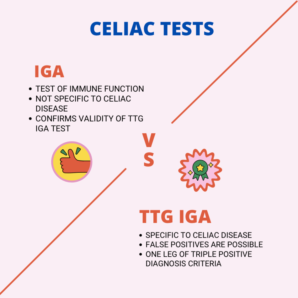 When testing for celiac disease, two of the most common tests run are the IGA and TTG IGA tests. They are related and have different functions in celiac testing. Celiac disease testing must be done while on a gluten containing diet.